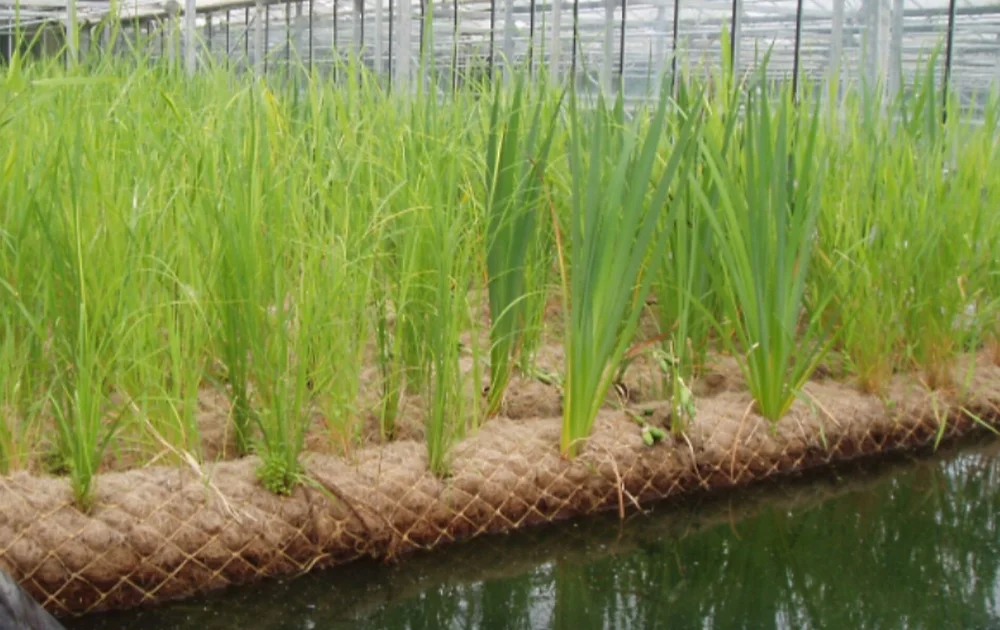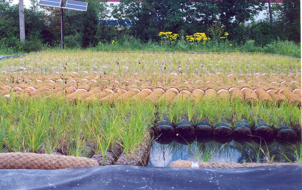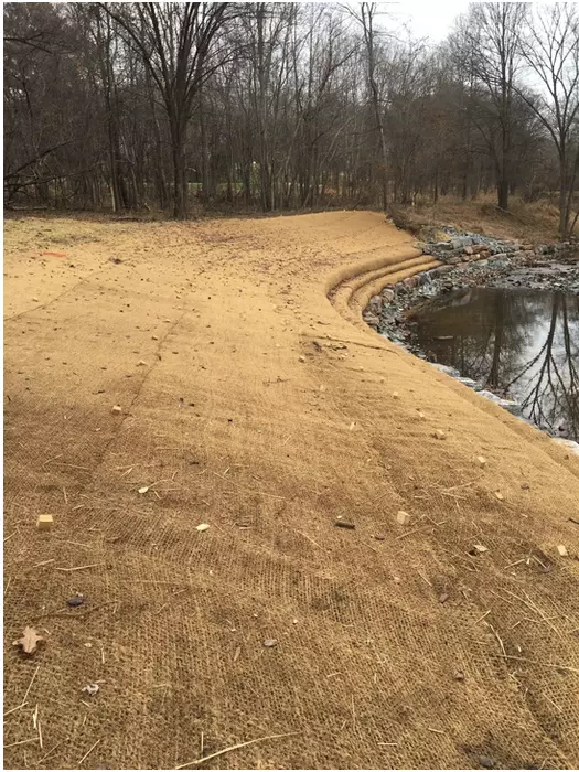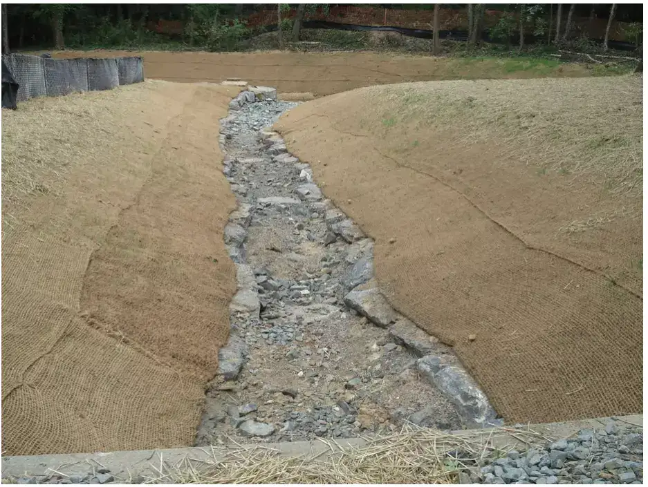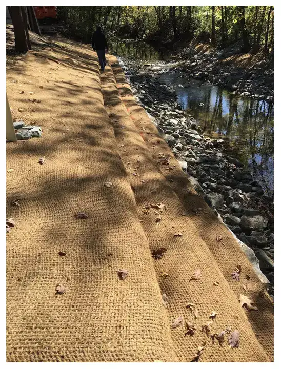 Geotextiles possess the right balance of strength and durability to effectively shield against erosion and allow for the successful growth of vegetation. H2M6, H2M5, H2M9 are the popular qualities. The utilization of coir fiber logs offers an environmentally friendly solution, contributing to a visually natural aesthetic while facilitating erosion stabilization through the gradual decomposition of the logs during which plants establish their root systems into the bank.